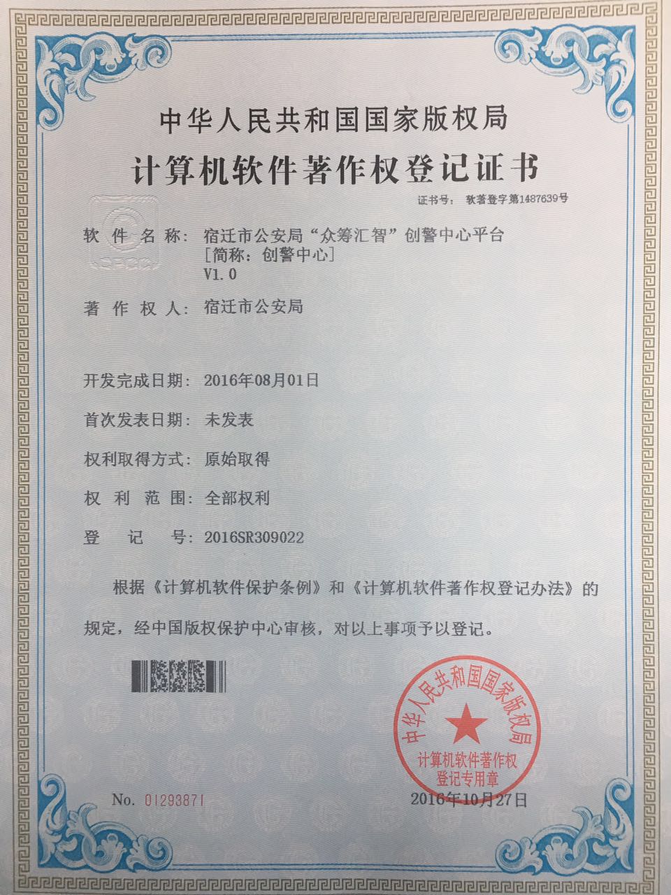 近日,由我司同宿遷市公安局自主研發(fā)的宿遷市公安局“眾籌匯智”創(chuàng)警中心平臺成功獲得軟件著作權(quán)登記證書。 市局研發(fā)的創(chuàng)警中心平臺為國內(nèi)首次發(fā)布,系市局首個(gè)自主開發(fā)、擁有自主版權(quán)的計(jì)算機(jī)軟件。此次軟件著作權(quán)的取得,對外展示了我...